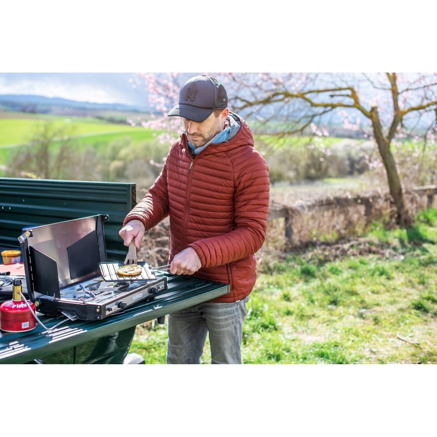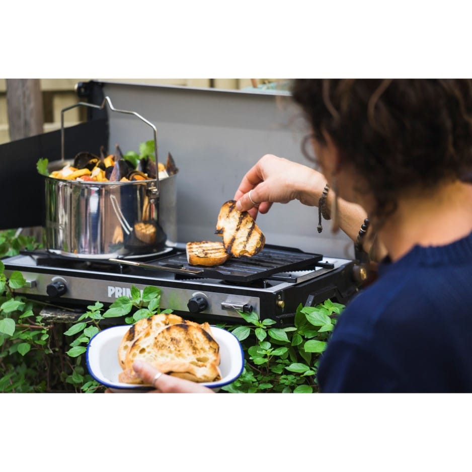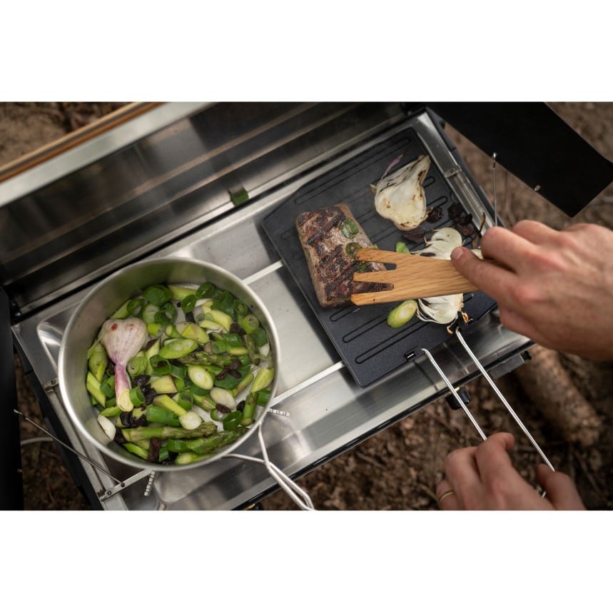 Grilli- ja paistolevy, joka on valmistettu valualumiinista tasaisen lämmönjakautumisen takaamiseksi. Non-stick-pinta mahdollistaa sujuvan grillauksen ja helpon puhdistuksen. Suunniteltu valuttamaan rasvaa ruoasta, jotta se saa kauniin grillipinnan. Sopii camping-keittiöön Tupike ja useimpiin muihin kahden polttimen keittiöihin.